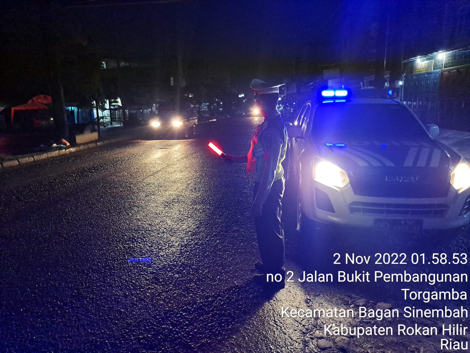Kegiatan patroli Blue Right dilaksanakan di Jalan Lintas Riau-Sumut Jalan Jendral Sudirman Jalan Sisinga Manga Raja Sei Buaya Kecamatan Bagan Sinembah Kabupaten Rohil, Rabu 02/11/2022, Pukul 01.00 Wib s/d selesai.