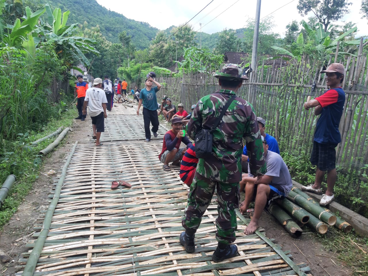 Kemudian, sebagai lantai jembatan dibuatkan anyaman bambu selebar 3 meter dengan panjang selaras.