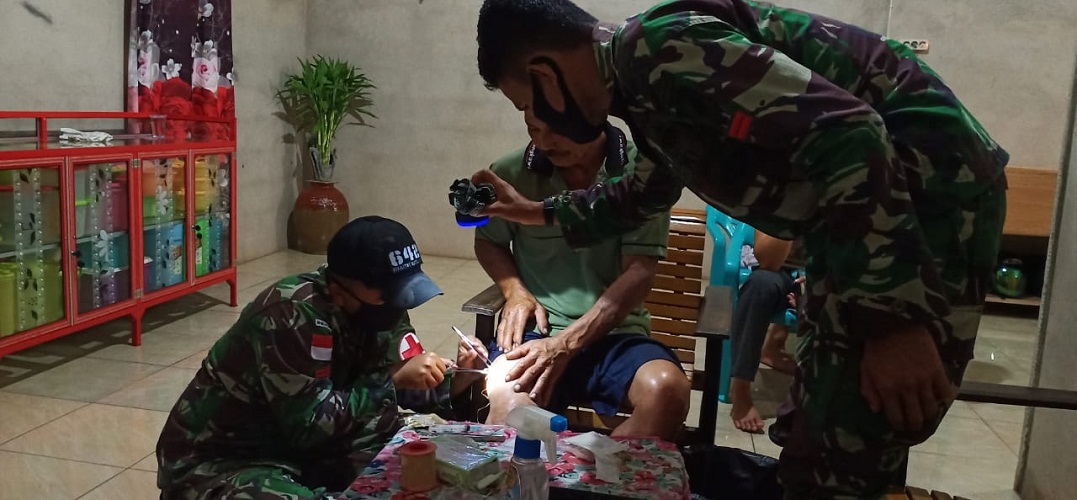 Bengkayang, Goosela.com – Alami luka robek di bagian paha, Martinus (47) meminta bantuan personel Satgas Pamtas RI-Malaysia Yonif 642/Kps untuk mendapatkan pertolongan pertama pengobatan terhadap lukanya.