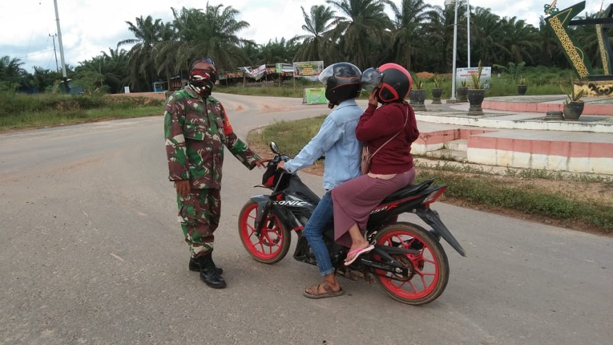 Sukamara, Goosela.com – Tim Gabungan Penanganan Covid-19 melaksanakan imbauan menggunakan masker kepada warga yang melintasi arus jalan lintas Kalbar di Pos gabungan penanganan Covid-19 di Desa Ajang, Kecamatan Permata Kecubung, Kabupaten Sukamara, Rabu (2/9/2020).