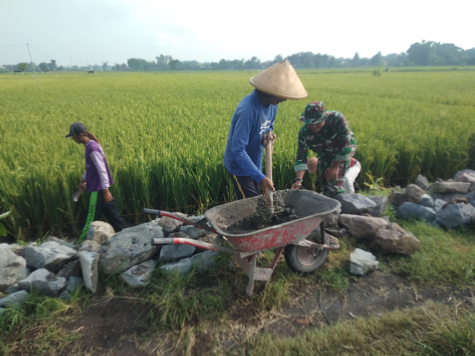 Sragen, Berbagai upaya dilakukan Babinsa dan masyarakat guna mewujudkan ketahanan pangan salah satu upaya yang saat ini sedang giat dilakukan adalah pembangunan infrastruktur pertanian seperti pembangunan talud badan irigasi.