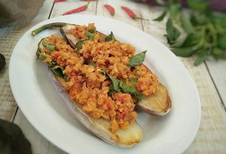 - Makanan terong bakar dengan sambal tempe siap untuk dimakan