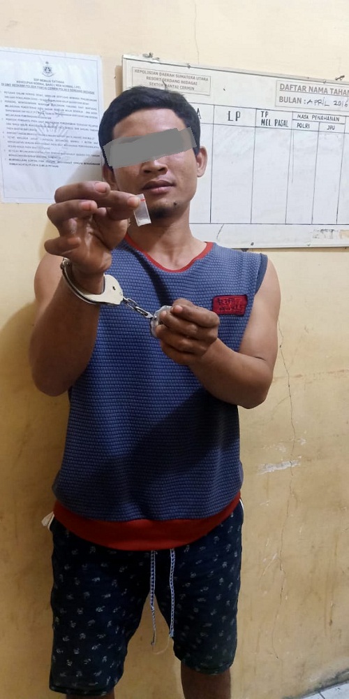 Tersangka Edo yang menetap di Dusun lV Desa Ujung Rambung Kec. P. Cermin Kab. Serdang Bedagai, tak berkutik saat petugas menemukan barang bukti 1 bungkus plastik klip transparan ukuran kecil berisikan serbuk putih diduga sabu, dan 1 unit sepeda motor Yamaha VegaZR Nopol BK 4504 XAC.