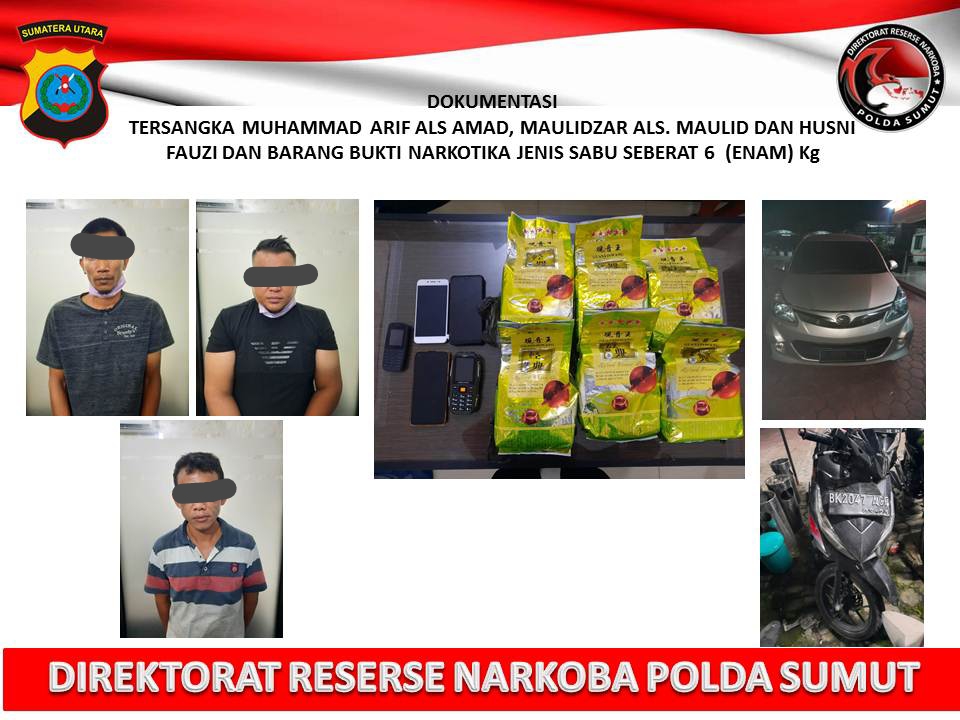 Dalam penangkapan tersebut ditemukan dan disita barang bukti berupa 6 (enam) bungkus plastik teh warna hijau bertuliskan tulisan cina merek Guanyinwang didalamnya berisikan Narkotika Jenis Sabu dengan berat keseluruhan seberat 6 (enam) Kg yang dibalut dengan plastik warna hitam yang disimpan didalam dashboard 1 (satu) unit mobil merek TOYOTA AVANZA warna silver dengan No. Pol B-1099-URR.