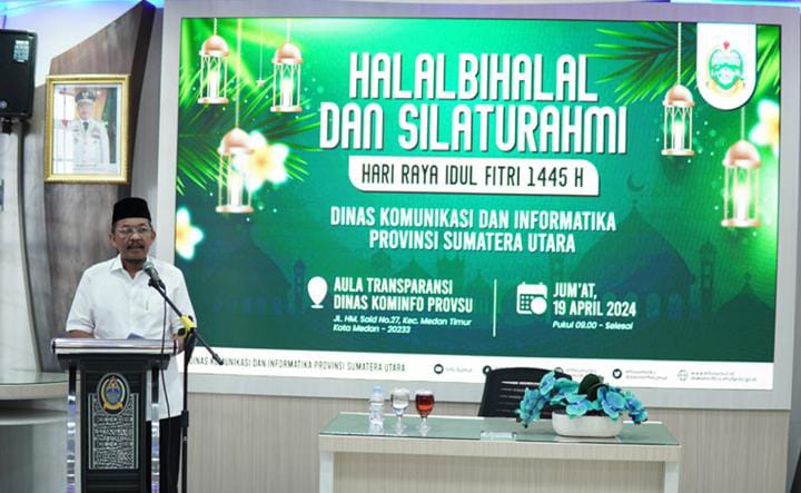 Medan – Keluarga besar Dinas Komunikasi dan Informatika (Kominfo) Sumatera Utara (Sumut) menggelar Halalbihalal di Aula Transparansi Kantor Dinas Kominfo Sumut, Jalan HM Said Nomor 27 Medan, Jumat (19/4/2024).