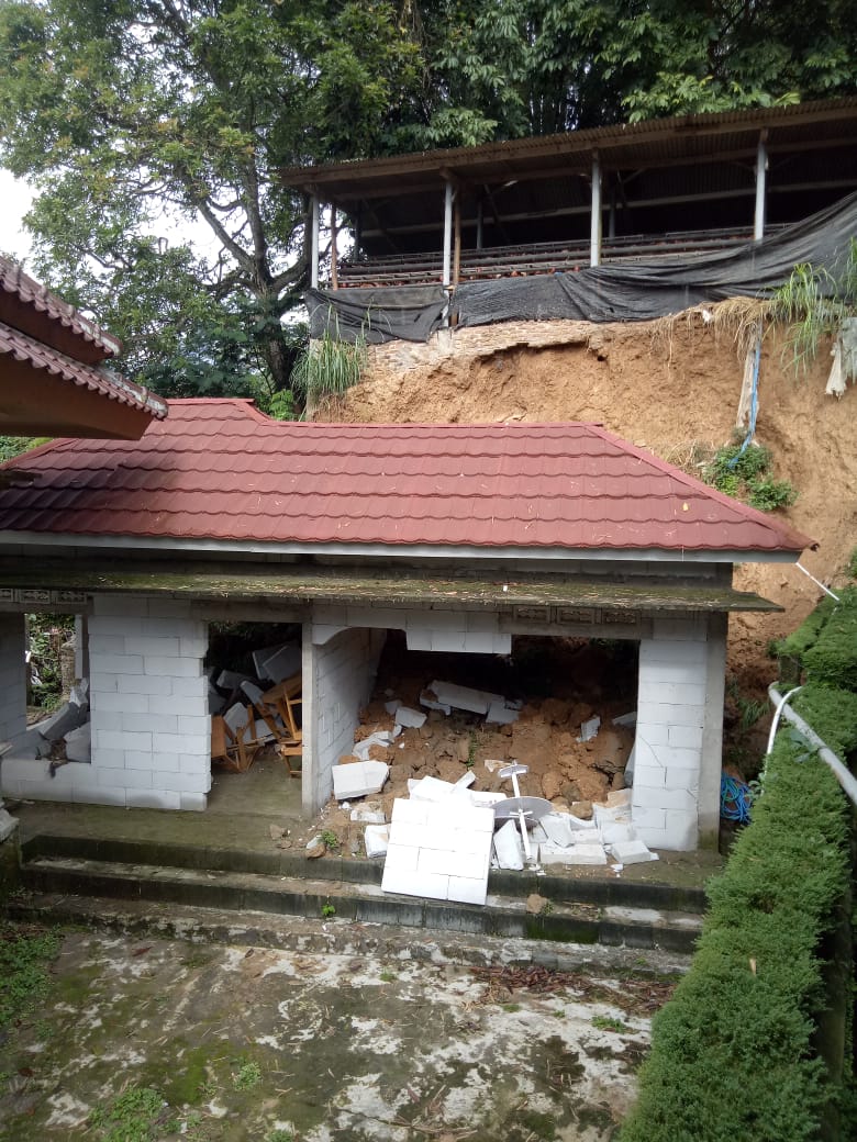 Sedangkan tanah longsor di sisi lain di Kelurahan tersebut sempat menjebol tembok padepokan pencak silat. Hempasan material menjebol tembok belakang, hingga ‘muntah’ ke bagian muka bangunan itu.