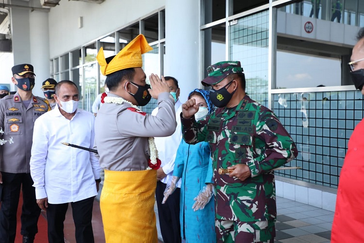 Irjen Pol Panca Putra tiba di Bandara Kualanamu sekira pukul 13.00 Wib dan langsung disambut dan menerima pengalungan bunga dari Gubernur Sumut Edy Rahmayadi.