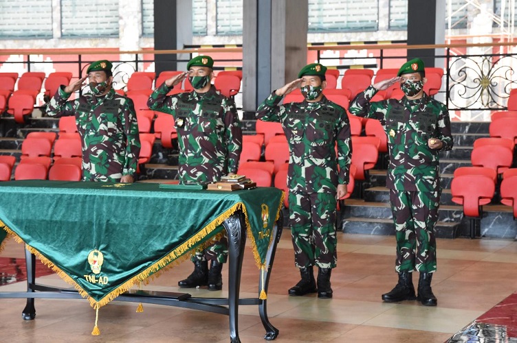 Jakarta, Goosela.com – Kepala Staf TNI Angkatan Darat (Kasad), Jenderal TNI Andika Perkasa, memimpin acara serah terima jabatan Inspektorat Jenderal Angkatan Darat (Irjenad) dari Letjen TNI Mochamad Effendi kepada Mayjen TNI Benny Susianto dan Panglima Komando Daerah Militer (Pangdam) V/Brawijaya dari Mayjen TNI Widodo Iryansyah kepada Mayjen TNI Suharyanto.