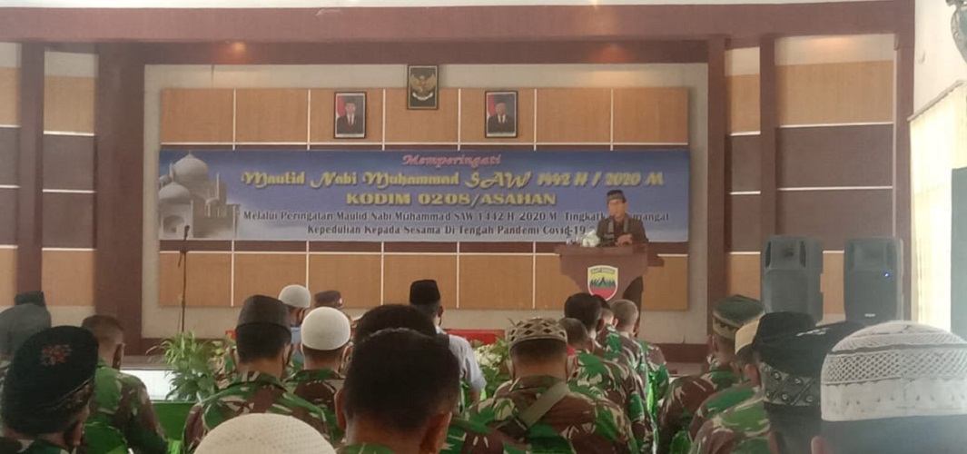 Peringatan Maulid Nabi Muhammad SAW yang diselenggarakan oleh Kodim 0208/AS mengangkat tema “Melalui peringatan Maulid Nabi Muhammad SAW tahun 1442 H 2020 M, Tingkatkan Semangat Kepedulian Kepada Sesama Ditengah Pandemi Covid-19.” (tLr-Pendim 0208/AS)