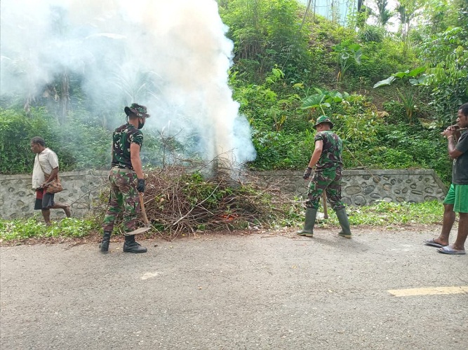 Keerom, Goosela.com – Guna menumbuhkan semangat gotong royong dan kebersamaan di lingkungan masyarakat perbatasan. Satgas Pamtas Yonif Raider 100/PS, Pos Kalilapar melaksanakan karya bhakti pembersihan lingkungan Kampung Sach, Distrik Waris, Kabupaten Keerom, Provinsi Papua, Senin (9/11/2020).