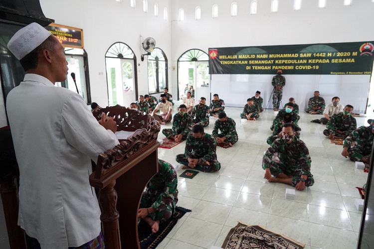 Danrem berharap, di momen peringatan Maulid Nabi Muhammad SAW ini, “Kita sebagai prajurit dan pegawai negeri sipil TNI AD hendaknya dapat menjadi kekuatan moral dan kekuatan kultural yang menyatu dengan rakyat untuk senantiasa menebar kebaikan dan menjauhi segala kemungkaran dimanapun bertugas dan berada di masa pandemi Covid- 19 ini”, tuturnya.