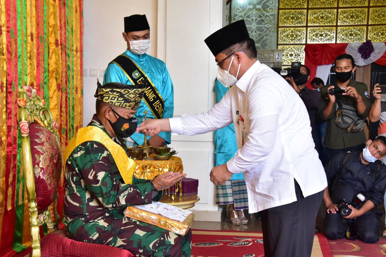 Pangdam I/BB juga Menerima tepung tawar yang di pimpin langsung oleh Ketua Kerapatan Adat LAMR Kabupaten Bengkalis, foto bersama dan pemberian cindera mata. (Sumber: Pendam I/BB)