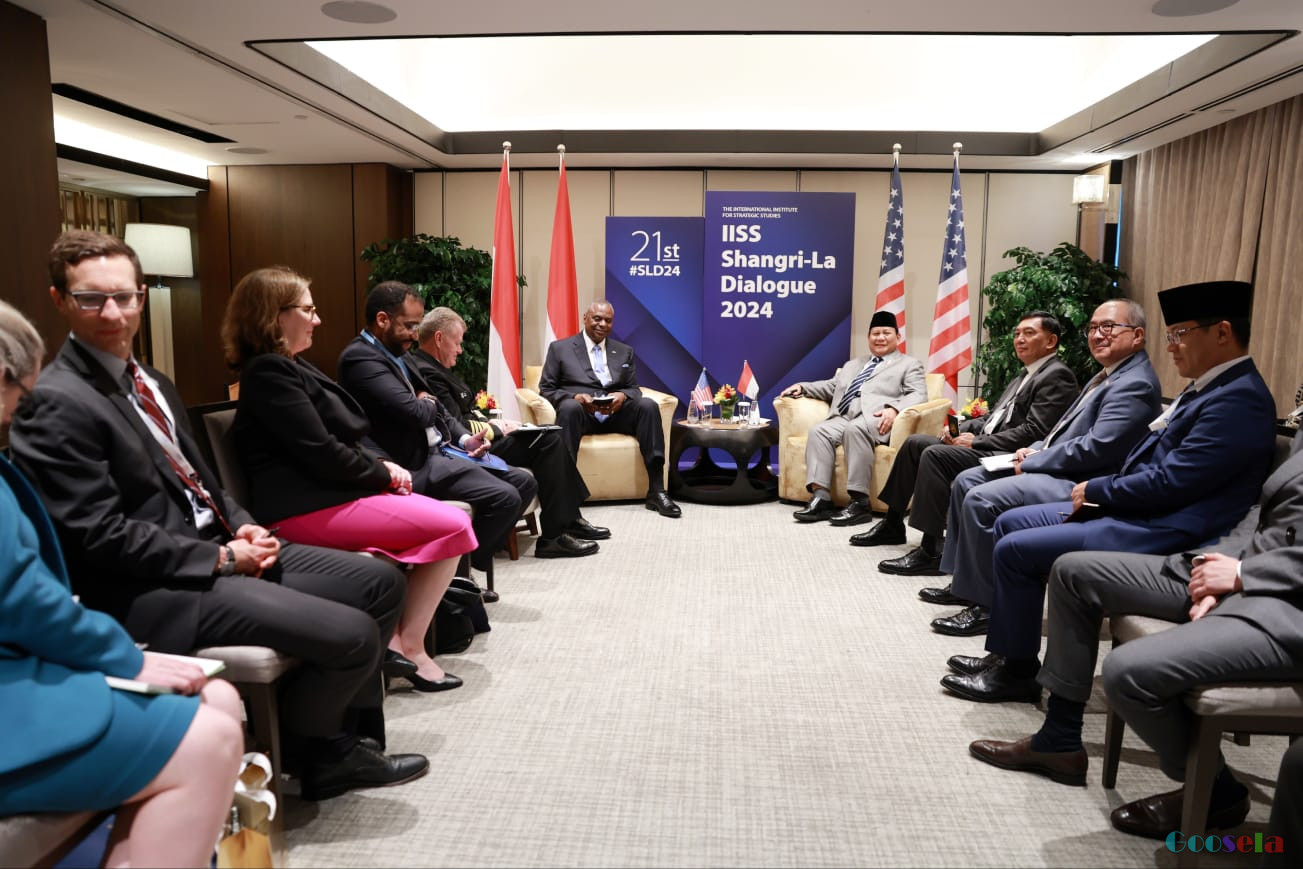 Jakarta – Menteri Pertahanan Republik Indonesia Prabowo Subianto bersama Menteri Pertahanan Amerika Serikat Lloyd J. Austin III melakukan pertemuan di sela-sela kegiatan IISS Shangri-La Dialogue 2024 di Singapura, Sabtu (1/6/2024).