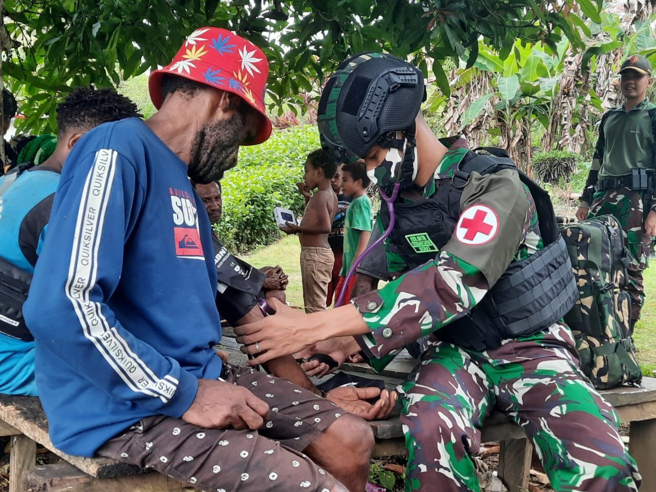 Keerom, Goosela.com – Dalam mempererat tali silaturahmi dan kerjasama guna terwujudnya Kemanunggalan TNI dengan Rakyat, Satgas Pamtas RI-PNG Yonif 131/Brs Pos Kout KM 31 melaksanakan pelayanan kesehatan gratis kepada masyarakat dan mengunjungi tokoh masyarakat (tomas) Kampung Baburia Distrik Arso Barat, Kab. Keerom, Papua (27/6/2021).