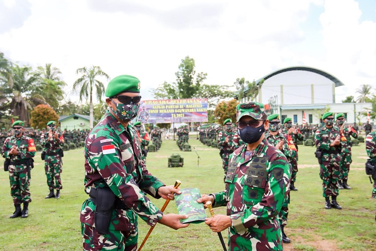 Mempawah, Goosela.com – Panglima Kodam XII/Tanjungpura, Mayjen TNI Muhammad Nur Rahmad memberangkatkan 450 prajurit Yonif Mekanis 643/Wanara Sakti yang tergabung dalam Satuan Tugas Pengamanan Perbatasan (Satgas Pamtas) Darat yang akan bertugas menjaga pertahanan di wilayah perbatasan Republik Indonesia – Malaysia. Upacara pelepasan berlangsung di Mayonif Mekanis 643/Wns, Selasa (18/5/2021).