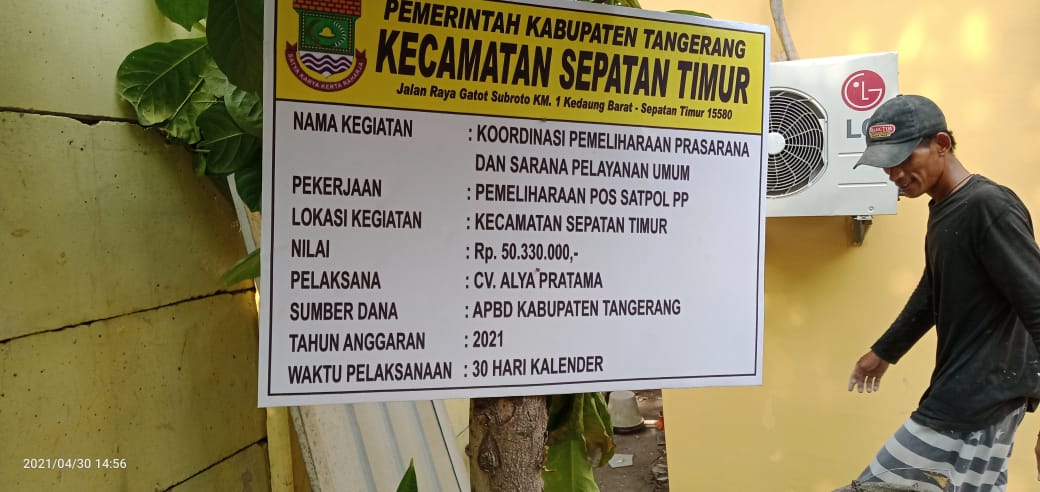 Tangerang, Goosela.com – Kegiatan Koordinasi Pemeliharaan prasarana dan sarana Pelayanan Umum yang bersumber dari dana APBD tahun 2021, salah satunya Kegiatan Pemeliharaan Pos satpol PP di wilayah Kecamatan Sepatan Timur Kabupaten Tanggerang yang di kerjakan CV. ALYA PRATAMA dengan nilai anggaraan Rp 50.330.000, diduga adanya kejanggalan, Senin (3/5/2021).