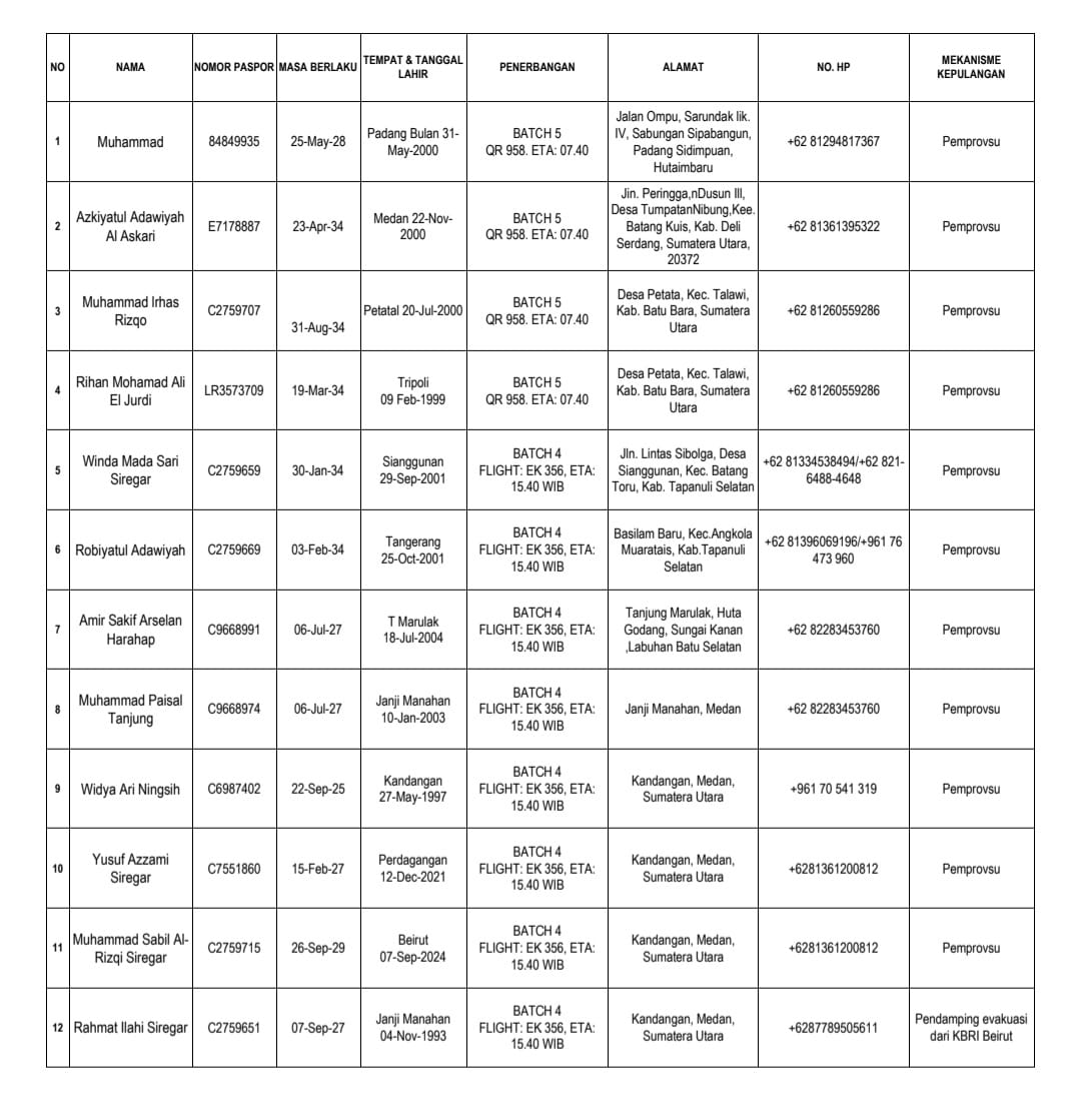 Berikut, ini daftar nama -nama WNI yang dipulangkan untuk menjaga keselamatan dari perang yang terjadi di Lebanon.
