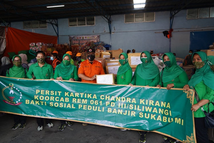 Sukabumi, Goosela.com – Ibu Ketua Persit KCK Koorcab Rem 061 memberikan bantuan kepada korban bencana alam banjir bandang yang terjadi akibat luapan Hullu sungai Citataih Kp. Cibuntu, Kabupaten Sukabumi, Jum’at (25/9/2020).