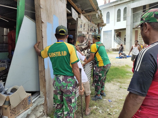 Jayapura, Goosela.com – Satgas Pamtas RI-PNG Yonif Mekanis Raider 413 Kostrad Pos Nafri menggelar kegiatan Karya Bhakti pembersihan lingkungan dan pembongkaran gudang di Masjid Al-Fatah Kampung Abe Pantai Distrik Abepura Kota Jayapura.
