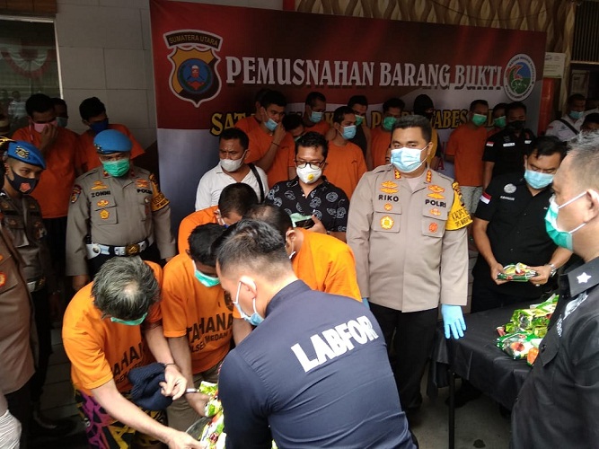 Hal itu disampaikan Kapolrestabes Medan, Kombes Pol Riko Sunarko didampingi Waka Satres Narkoba Polrestabes Medan, Kompol Doly Nainggolan, Kapolsek Percut Seituan, AKP Ricky Pripurna Atmaja, Kapolsek Patumbak, Kompol Arvin, pihak Kejaksaan, BNN serta penggiat anti Narkoba saat pemusnahan barang bukti 54,9 Kg sabu dan 977 butir pil Ekstasi hasil ungkapan Satres Narkoba Polrestabes Medan, Polsek Medan Kota, Polsek Patumbak dan Polsek Percut Seituan di depan Mako Satres Narkoba Mapolrestabes Medan, Rabu (11/11/2020) siang.