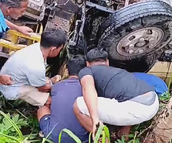 Akibat tabrakan itu, truk terbalik di rerumputan pinggir jalan. Sementara motor yang dikendarai korban dalam kondisi remuk tanpa bentuk.