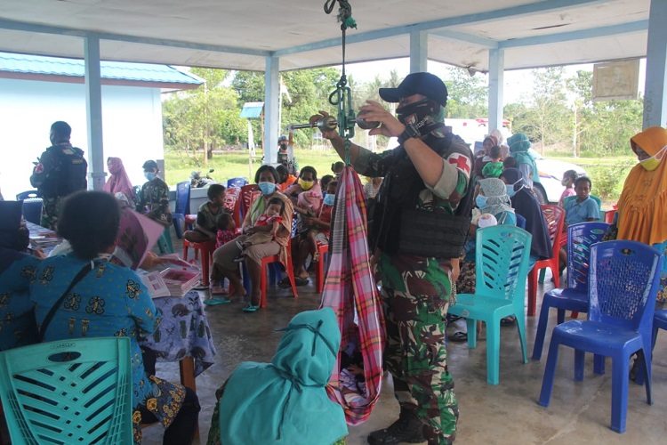 Keerom, Goosela.comPrajurit Satgas Pamtas RI-PNG Yonif Raider 100/PS Pos Kotis bekerjasama dengan Puskesmas Ywan membantu pelaksanaan Pos Pelayanan Terpadu (Posyandu) dalam pemeriksaan kesehatan anak usia dini di Kampung Wonorejo, Distrik Mannem, Kabupaten Keerom, Provinsi Papua, Senin (7/9/2020).
