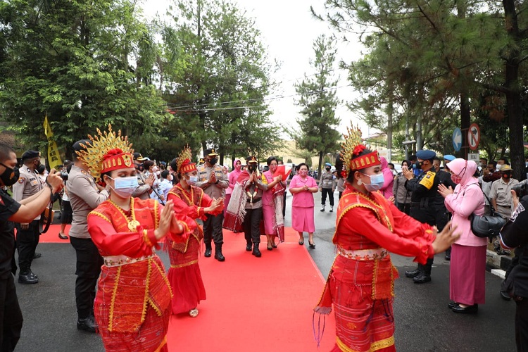 Diiringi tarian etnis, Irjen Pol RZ Panca Putra beserta istri menuju gedung utama Mapolda Sumut. Seluruh kegiatan penyambutan Kapolda Sumut tetap dilaksanakan dengan menerapkan protokol kesehatan guna pencegahan Covid-19.