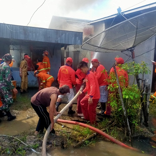 Sambas, Goosela.com – Akibat hubungan pendek (Korsleting) listrik menyebabkan terbakarnya tiga unit rumah warga di RT. 001 RW 03, Dusun Sejahtera, Desa Gugah Sejahtera, Kecamatan Pemangkat, Kabupaten Sambas, tadi pagi. Untuk itu personel Koramil 1208-05/Pemangkat terjun membantu memadamkan si jago merah, Senin (8/2/21).