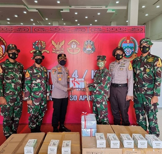 Medan, Goosela.com – Dandim 0201/BS, Kolonel Inf Agus Setiandar, SIP, mewakili Pangdam I/BB untuk menyerahkan bantuan 20.000 masker kepada peserta Latsitardanus XLI Satlat-4/Kijang di Asrama Haji Medan, Jl. A.H Nasution, Kec. Medan Johor, Rabu (8/4/2021).