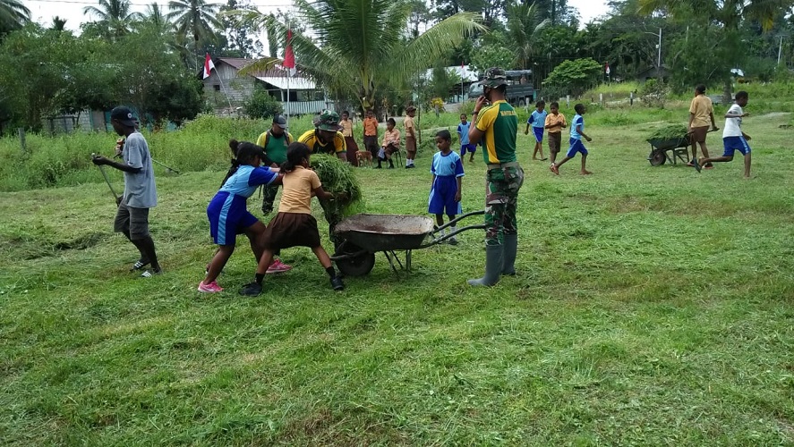 Keerom, Goosela.com Satgas Pamtas RI-PNG Yonif Mekanis Raider 413 Kostrad menggelar pembersihan lingkungan bersama para siswa Sekolah SD dan SMP Mahanaim bertempat di Kampung Yetti Distrik Arso Timur, Kabupaten Keerom.